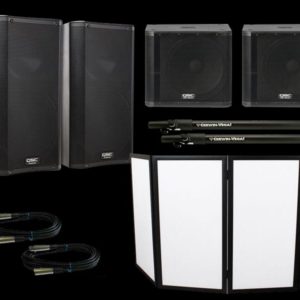 “Full DJ Setup Package 4 – 2x QSC K12 Speakers + QSC KW181 Powered Subwoofer + Cables + Fascade”